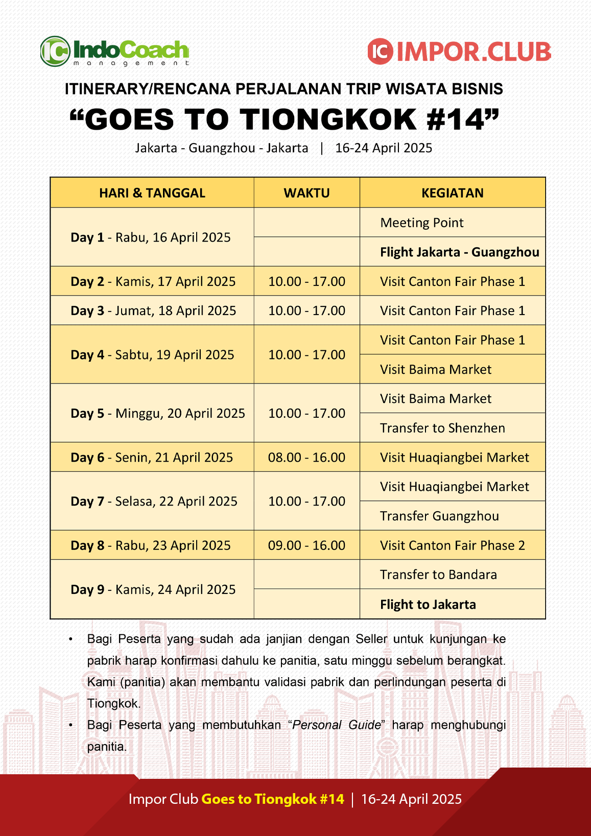 Berbeda dengan paket wisata biasa, dengan Wisata Bisnis Goes To Tiongkok #16 Anda bisa jalan-jalan sekaligus langsung praktek jadi importir yang bisa memberi cuan besar.